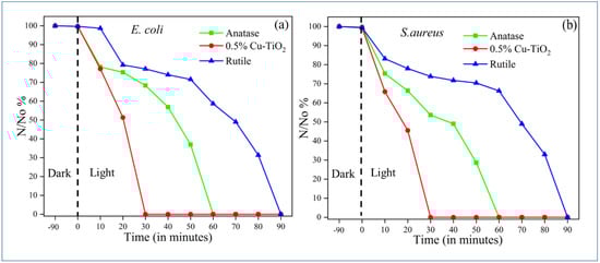 Photocatalytic inactivation of (a) E. coli and (b) S. aureus with anatase, rutile and 0.5% Cu-TiO2 650 °C samples.