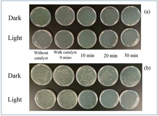 Images of (a) E. coli colonies and (b) S. aureus colonies on agar plates after various time intervals of Cu-TiO2 650 °C.