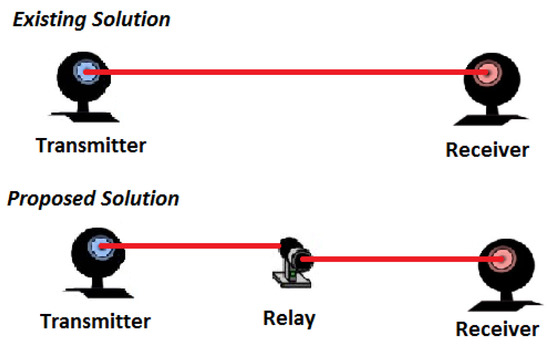 The average electrical signal to noise ratio (SNR) is defined as , where denotes the statistical expectation. The proposed system uses a single decode and a forward relay. The relay would help to shorten the communication link as shown in Figure 1. The impact of the decrease of the link length would significantly reduce the turbulence effect and path loss.