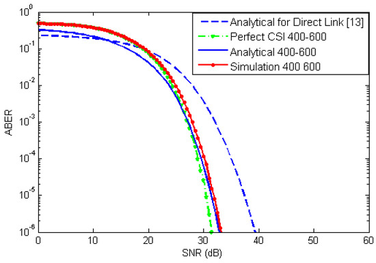 ABER performance for the direct link and a single relay after 400 m from the source, over weak turbulence.