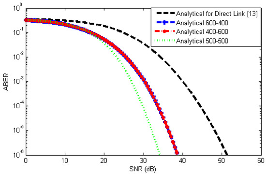 The derived analytical results were verified with Monte Carlo simulations. Figure 2, Figure 3 and Figure 4 show the weak turbulence. Figure 5 shows the combined analytical values for moderate turbulence. Figure 2, Figure 3, Figure 4 and Figure 5 show that the ABER decreased when a relay is added due to decreasing the distance. When comparing the figures with weak turbulence, Figure 2 with Figure 3 and Figure 4, it can be seen that the best location for the relay is in the middle of the channel. We have tried all the ranges for the relay, which showed that the equidistant relay is the best location. Figure 5 shows that the best location for the relay for moderate turbulence is also in the middle of the channel.
