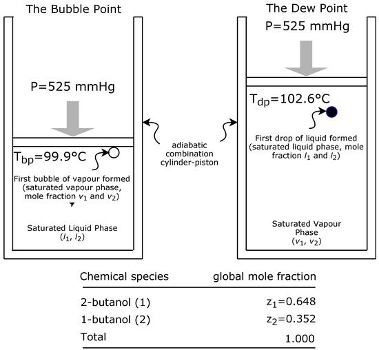 To illustrate the concepts introduced before, we propose the following example. Let us assume a liquid mixture of 2-butanol and 1-butanol with a mole fraction of 0.352 and 0.648, respectively, as shown in Figure 1. For this binary system, the chemical species 2-butanol is more volatile than the chemical species 1-butanol. The mixture is enclosed in a cylinder with a piston at 98 C, and 525 mmHg, and the mixture is slowly heated at a constant pressure to a temperature of 104 C so that it is in equilibrium all the time.