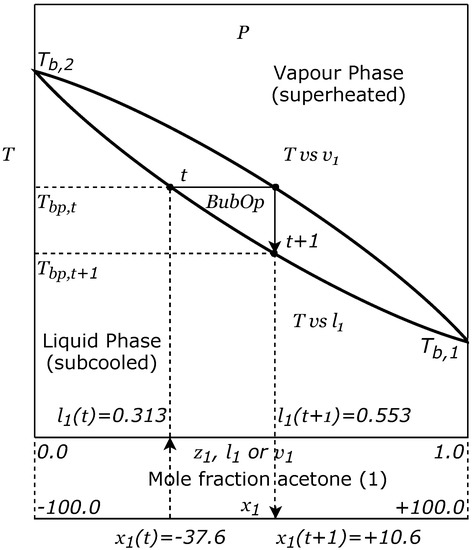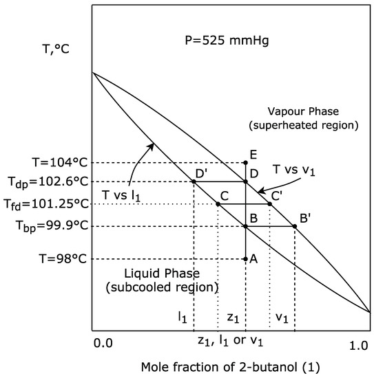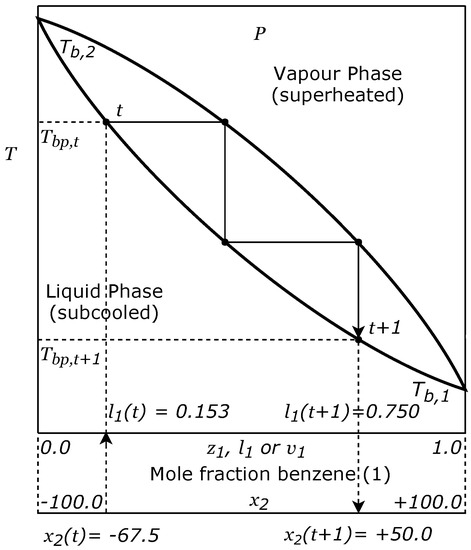 Similarly, the condition in (9) must be satisfied at the dew point to calculate its temperature and the composition of the first drop of liquid produced, i.e., . In these situations, the liquid produced is in equilibrium with the vapour phase, which has a molar composition = . This equation is generated by combining (4)–(7).