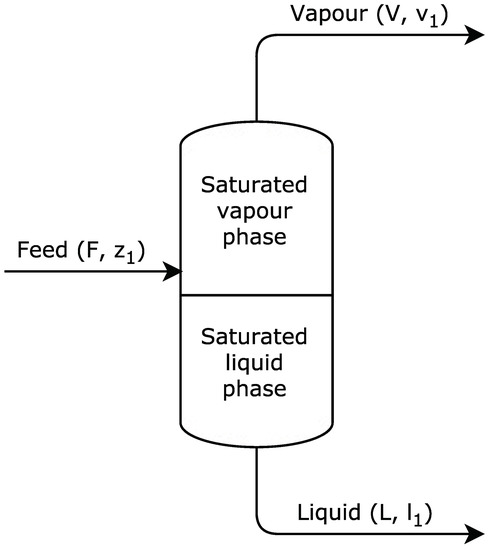 Finally, for the flash distillation calculations, the condition in (10) must be satisfied in order to calculate the = ratio and the molar fraction of the liquid formed, i.e., . Under these conditions, the vapour phase formed is in equilibrium with the liquid phase which has a molar fraction . Equation (10) is described by combining (1)–(7). It is solved for , also using the bisection numerical method [41].