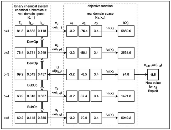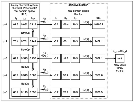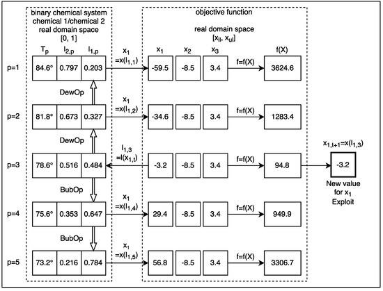 Focusing on the exploitation stage, the value of a decision variable is calculated based on the flash distillation process of the binary chemical mixture associated with the same decision variable. The value of the decision variable is adjusted based on the thermodynamic state providing the best fitness value in a similar way as for the exploration stage. Thus, Figure 6 shows how the new values of a decision variable are obtained during the exploitation stage, where is the flash distillation temperature for the decision variable . This figure corresponds to the same case of Figure 4.