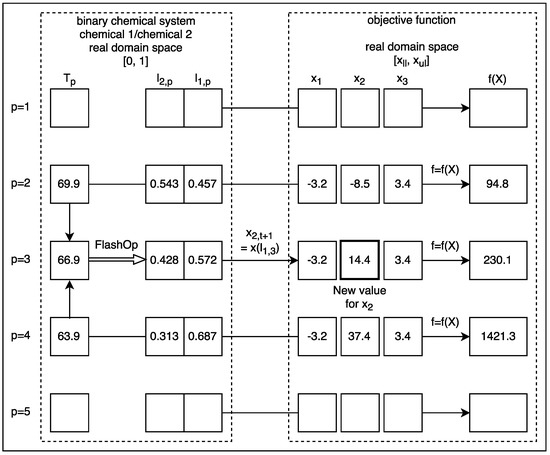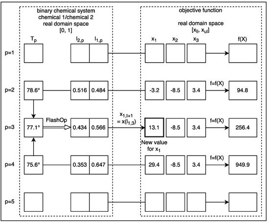 In this proposal, each decision variable is handled as the lightest chemical species of a given binary liquid mixture at a specified pressure and temperature, where the system pressure remains constant for all thermodynamic equilibrium calculations.
