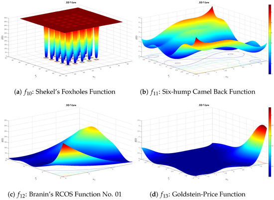 Another general observation can be obtained if the root-mean-square error or is used as shown in Equation (36). The measures the average of the squared errors, that is, the difference between the estimator and what is estimated. In this case, the estimator considered is the average of the fitness of the reference function, determined by the optimization algorithm, and what is estimated is the value of the true optimum of the reference function. In Equation (36), is any of the metaheuristics indicated, i.e., VLE, PSO, GSA, DE or WOA, and F is the number of data considered. Table 12 shows the values calculated for the 15 classical functions and the five algorithms considered in this study. Table 12 also presents the values calculated for VLE and DE, excluding functions and due to lack of information for DE. With these results, it can be stated that, in general, the average fitness obtained by VLE is better adjusted to the true optimum of the reference functions than any of the published data sets for PSO, GSA, DE, and WOA. Considering the 15 classical functions, the value for VLE is 22.388, for PSO it is 1995.7, for GSA it is 2527.7, and for WOA 1933.6. Excluding functions f14 and f15, the values for VLE, PSO, GSA, DE and WOA are 24.048, 2143.7, 2715.2, 413.53 and 2077.0, respectively. According to this statistic metric, the obtained by VLE under these circumstances is lower than that obtained by the other algorithms.