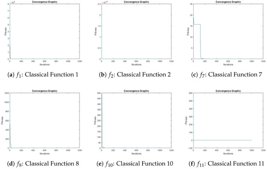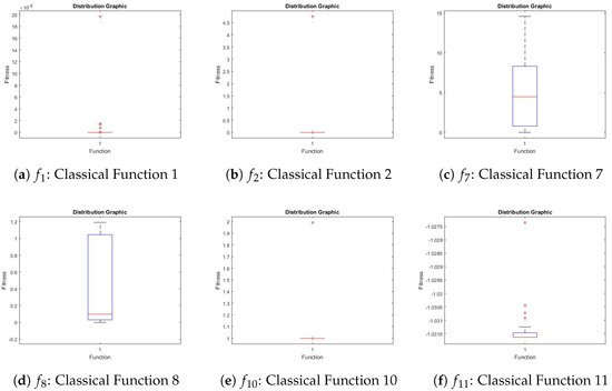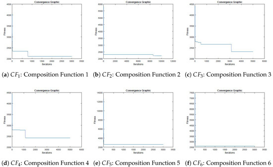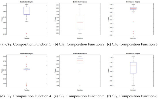 Similarly, Table 13 shows the statistical results obtained with the second set of optimization problems, i.e., the composite functions, which are the following: the benchmark function (BenFun), the average value (Avg), the standard deviation (StdDev), the median (Med), the minimum value achieved (Min), the optimal value published (Opt), the difference between the minimum value achieved (Min) and the optimal value published (), the true percentage deviation (, %), and the maximum value reached (Max). Figure 19 shows the convergence graphics obtained by VLE for these benchmark functions. The number of iterations was fixed at 1000, 3000, 5000 and 10000 for these functions. Figure 20 shows the distribution graphics obtained by VLE for the composite functions chosen. All experiments were repeated at least 31 times to guarantee a meaningful statistical analysis.