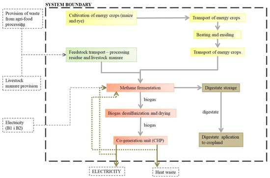 System boundary of the electricity production from agricultural biogas in the examined agricultural biogas plants [11].