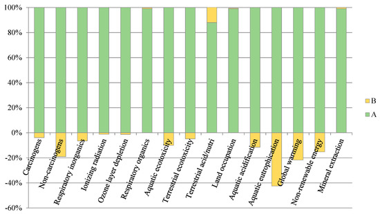 The analysis of the results of the conducted studies demonstrated that Biogas Plant A generates a negative environmental impact. The value of the eco-indicator for this type of installation amounts to 2.02 Pt. On the other hand, Biogas Plant B demonstrates a negative eco-indicator value of −0.25 Pt, which means that it generates favourable environmental effects during its operation (Table 2). The environmental benefit gained in the Biogas Plant B results from the fact that the positive environmental impact associated with its operation exceeds appearing related burdens. It is associated not only with the organisation of waste-to-energy stage in this installation but also with a significant limitation of wheeled transport of raw materials.