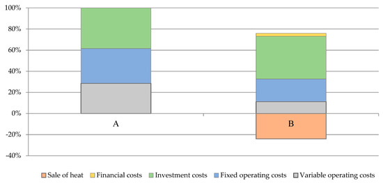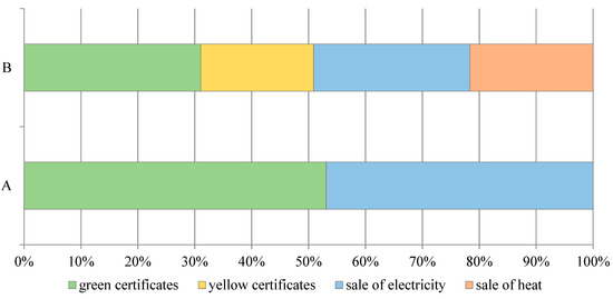 The structure of the LCOE ratio indicates that the use of generated heat has the strongest impact on the decrease of LCOE ratio (Figure 5). Moreover, variable operating costs have a significant impact on the value of the distributed electricity production cost, more precisely, the application of cheap waste raw materials instead of costly silage of energy crops. On the other hand, in both Biogas Plants A and B, investment costs have a comparable share in the total value of the LCOE ratio.