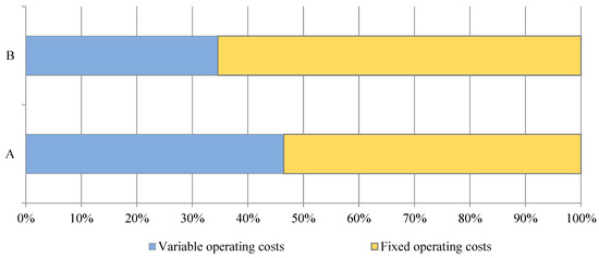 The structure of revenues in an agricultural biogas plant consists mainly of revenues from the sale of electricity to external customers and revenues from the disposal of property rights to certificates of origin of energy from renewable sources (Figure 3). It was Polish legal regulations, which were in force until 2015. This research was conducted based on data from the year 2014. It was a subsidiary system based on the sale of property rights to the origin of energy from renewable sources, the so-called “green certificates”. Furthermore, producers of renewable energy were entitled to obtain “yellow certificates” in the case of the high-energy co-generation of energy and heat. Companies dealing with electrical power and selling it to the final consumers were obliged to purchase electrical power from renewable energy sources. On the other hand, feedstock substrates required for the appropriate performance of the fermentation process represent the main source of variable operating costs (Figure 4). Together with the costs related to the transport of substrates, these make up almost 50% of all operating costs.