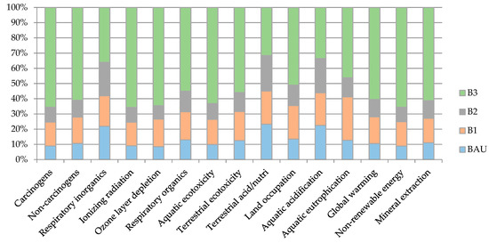 The sensitivity analysis of selected results for the “business as usual” (BAU) variant of Biogas Plant B was carried out by using the comparative method in the assumption of feedstock type. The BAU business variant was modified in three different ways. It was assumed that the amount of energy produced will not change; therefore, only the mass of substrates was changed with regard to the same amount of methane produced in the BAU variant. In the B1 variant, maize silage was used instead of livestock manure; in the B2 variant, potato pulp was used instead of maize silage; while in the B3 variant, potato pulp and distiller were used instead of maize silage. The highest environmental impact was observed for B3, where potato pulp was used instead of maize silage and distiller residues (Figure 6). When comparing the B2 variant with BAU, it can be noticed that the replacement of maize silage with potato pulp does not significantly increase the environmental impact of Biogas Plant B. This is related to the fact that the supply of maize silage to the fermentation tank requires the use of wheeled transport for this purpose (agricultural tractor). In option B2, replacing the maize silage with potato pulp did not change the way of transport or the length of the road. The reduction of the environmental impact can only be fulfilled in the case of the substitution of wheeled transport by pipeline transport. The environmental impact of variant B1 in the case of replacing the distiller with maize silage also increases the negative environmental impact. However, these are not significant differences, because for the maize silage, the dry organic matter content and biogas productivity index are much higher than for other substrates.