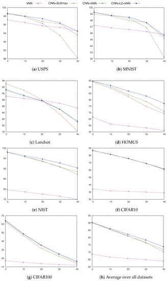 Figure 3 shows the impact on the average when using different values of k. As can be seen, the inclusion of kNN is more beneficial when the noise is higher. In addition, the value of k for outperforming the softmax depends on the amount of noise. The higher the noise, the higher k should be, but in all cases, this is a relatively small value (lower than 15). Therefore, the value of k is not so decisive to improve the results of the base CNN + softmax as long as it has been increased enough to surpass the elbow of the curve.