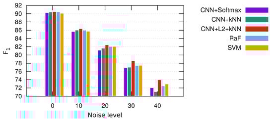 The four configurations (kNN, CNN + softmax, CNN + kNN and CNN + + kNN) have been evaluated with and without adding synthetic noise to the data by swapping the labels of pairs of randomly-chosen prototypes. The percentages of prototypes that change their label are 10%, 20%, 30% and 40% since these are the common values in this kind of experimentation [31]. It is important to remark that each CNN has been trained separately for each noise level, from 0% to 40%. Then, the weights obtained at each noise level were used as a basis for evaluating the different CNN configurations at that noise level.
