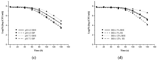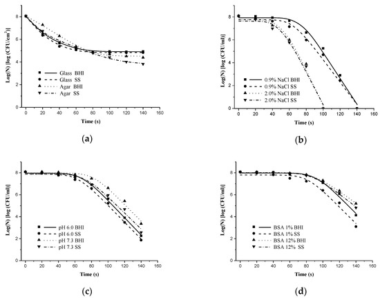 Survival curves of S. typhimurium and S. aureus in liquid media are shown in Figure 1b–d, and Figure 2b–d. The survival curves exhibited a shoulder region followed by a log-linear phase regardless of liquid medium and bacterial species. The shoulder region has been attributed to the time required by generated germicidal agents in NTP treatments to reach the minimum concentrations on cell membranes for causing damages to bacterial cells [29]. Hence, the differences in shoulder phase length or duration reflect the requirement of limiting levels of germicidal agents to start inactivating bacteria or thresholds for formed germicidal agents to start damaging microbial cells on different media. Once the concentration of germicidal agents passes the threshold, a log-linear phase is triggered, resulting in irreversible damage and lysis of the cells [29].
