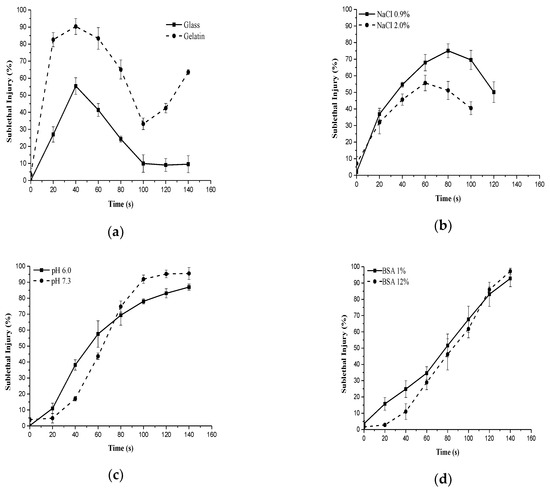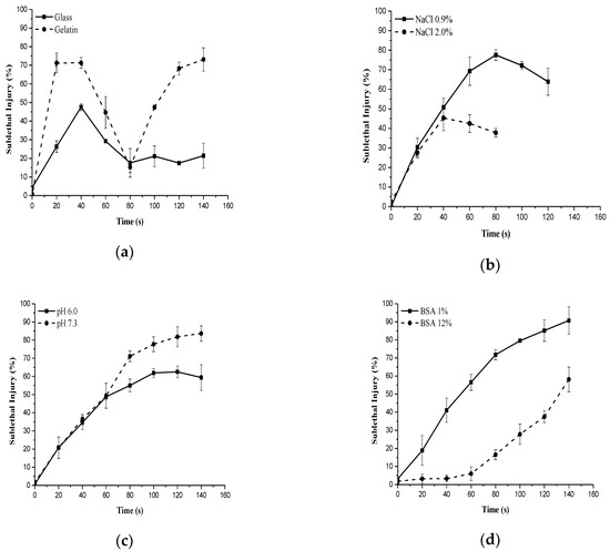 Changes in sublethal injury (%) of S. typhimurium during DBD-NTP treatment. Cells were inactivated on glass and gelatin surfaces (a) and in liquid suspensions of NaCl (b), PBS (c), and BSA (d).