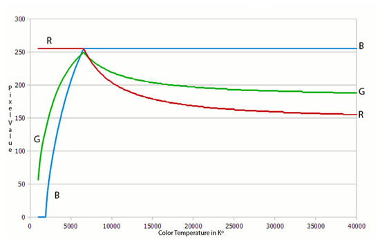 Our system is operating in natural environment and therefore prevailing weather has significant influence on the tonality of the images taken at the test site. Obviously, the lighting will be different in a different time of a day and a different time of a year, and thus the toning of the images will be changing according to lighting. Color temperature is a property of a light source. It is the temperature of the ideal black-body radiator that radiates light of the same color as the corresponding light source. In this context black-body radiation is the thermal electromagnetic radiation emitted by a black body. A black-body is an opaque and non-reflective body. It has a specific spectrum and intensity that depends only on the temperature of the black-body, and it is assumed to be uniform and constant. In our case, the light source is the sun that closely approximates a black-body radiator. Even though the color of the sun may appear different depending on its position, the changing of color is mainly due to the scattering of light and it is not because of the changes in the black-body radiation [13,14,15,16]. Color matching functions (CMFs) provide the absolute energy values of three primary colors which appear the same as each spectrum color. We applied the International Commission on Illumination (Commission internationale de l’éclairage, CIE) 10-deg color matching functions in our data augmentation algorithm [17].