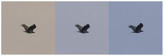 Data example of the White-tailed Eagle. The image on the left is an augmented image with the color temperature 5600 K. The original image is in the middle with color temperature 7600 K. The image on the right is an augmented image with the color temperature 9600 K.