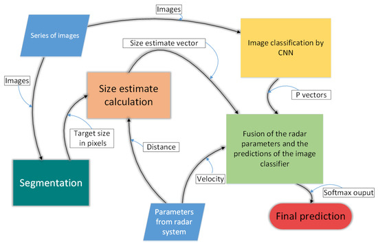 The final classification is achieved by a fusion between the parameters provided by the radar and the predictions from the image classifier. The combined P-vector for a series of images is: