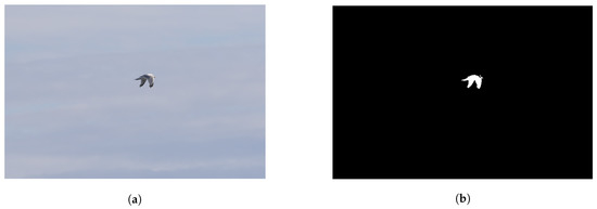 Segmentation is computed in parallel to image classification in order to obtain an estimate of the target bird size in pixels, i.e., despite that segmentation is computed simultaneously when the classification process is started, it is not part of the actual classification, but the result of the segmentation is used for assigning a value to the size estimate parameter. When the estimate in pixels is known, the target bird size estimate in meters can be calculated. We studied methods from simple threshold to fuzzy logic for solving the problem at hand i.e., a dark figure against bright background and vice versa as well. At the extremity, the background and the target can share several colors in the RGB color space. We achieved the best results by applying fuzzy logic segmentation compared to the threshold segmentation and the edge detection segmentation [22,23]. In particular, we applied Mamdani’s fuzzy inference method [24]. Figure 4a,b show an example of segmentation.