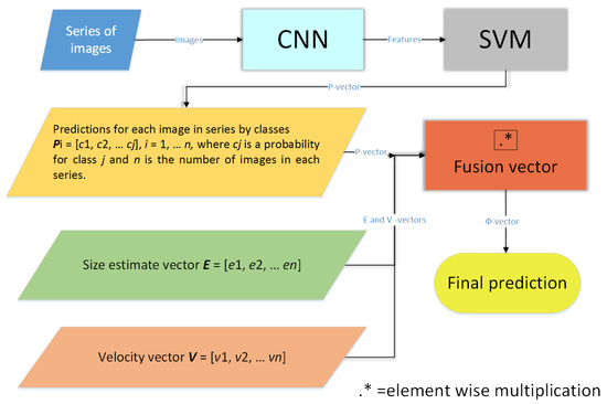 The classification process is presented in Figure 5. Series of images of a single target (i.e., as a sequence of temporally consecutive frames of the same bird) are fed to the CNN that is applied to feature extraction. The two-step learning method is applied, i.e., the CNN is trained with the first N-1 layers viewed as feature maps and these maps are used to train a Support Vector Machine (SVM) classifier [25]. The SVM classifier makes use of one-versus-all binary learners, in which, for each binary learner, one class is positive and the rest are negative. The total number of the binary learners is the same as the number of classes. A linear classification model is applied. Stochastic gradient descent with 10 as the mini-batch size, and the Hinge loss function with regularization term 1/n, where n is a number of training examples [26,27] are also applied. The output of the SVM is presented as P-vectors as follows: