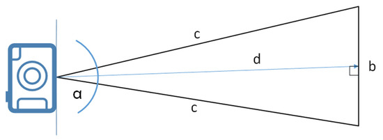 There are also two parameters based on information provided by the radar system. The size of the target bird is estimated as follows. The frame size ([width x height y], in pixels) of the camera and the angle of view () of the lens are known. The distance (d) to the target bird is provided by the radar. The maximum number of horizontal () and vertical () pixels of the target bird are calculated from the segmented image, respectively. The angle of view, b, at the distance, d, is calculated over a right-angled triangle (see Figure 6). The horizontal number of pixels/meter is given by