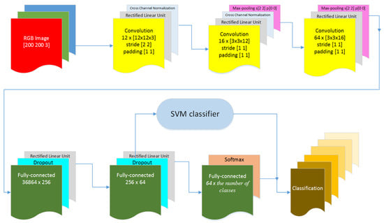 The input image is normalized and zero-centered before feeding it to the network. CNN with Mini-batch training and supervised mode as well as stochastic gradient descent with momentum is applied [28,29,30,31]. The L2 Regularization (i.e., weight decay) method for reducing over-fitting is also applied [30,31,32]. Due to limited capacity of computer resources the network size in terms of free parameters is kept small, thus resulting in total of 92 feature maps which are extracted by convolution layers with kernel sizes , and , respectively. Total number of weights is about 9.47 × 106.