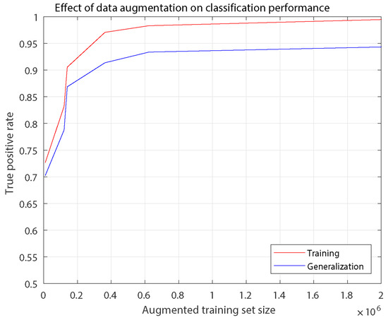 The best performance (in TPR) of the two models trained on the original data set is 0.7362. Performance for the models trained on the augmented data sets varies between 0.8687 and 0.9984, which shows clear improvement as the augmented training set size increases and especially compared to the models trained on the original set. Training with and without the dropout technique implied that overfitting will occur to some extent as the data augmentation is applied and the dropout technique decreases this overfitting. The results were different for the original data sets, in which case overfitting was insignificant. These results are logical due to the fact that the enhancement in performance obtained by the data augmentation is extracted from the original images, and thus it inevitably increases redundancy. The results for the original data sets imply that the number of training examples was simply not large enough.