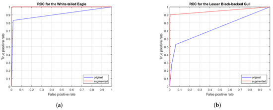 ROC curves for the White-tailed Eagle and the Lesser Black-backed Gull. (a) AUC for the original data set and for the augmented data set is 0.9137 and 0.9993, respectively; (b) AUC for the original data set and for the augmented data set is 0.7460 and 0.9496, respectively.