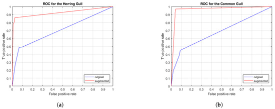 ROC curves for the Herring Gull and the Common Gull. (a) AUC for the original data set and for the augmented data set is 0.6926 and 0.9128, respectively; (b) AUC for the original data set and for the augmented data set is 0.6967 and 0.9644, respectively.