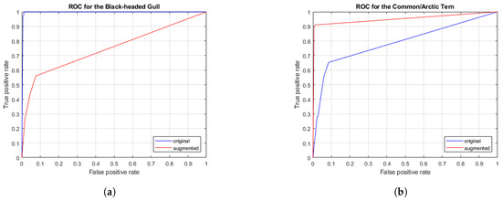 ROC curves for the Black-headed Gull and the Common/Artic Tern. (a) AUC for the original data set and for the augmented data set is 0.7583 and 0.9972, respectively; (b) AUC for the original data set and for the augmented data set is 0.8111 and 0.9508, respectively.