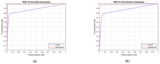 ROC curves for the Great Cormorant and the Common Goldeneye. (a) AUC for the original data set and for the augmented data set is 0.8853 and 0.9870, respectively. (b) AUC for the original data set and for the augmented data set is 0.0.8807 and 0.9829, respectively.