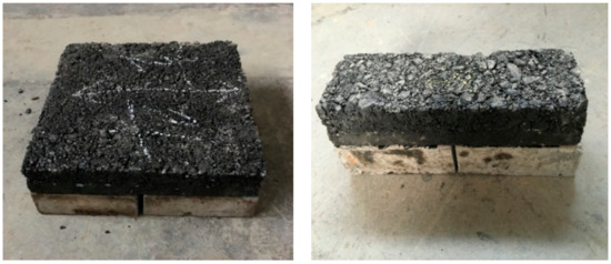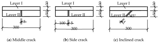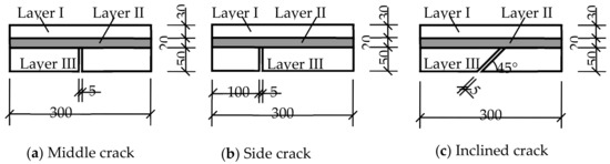 The size of the composite structure specimen was 300 × 90 × 100 mm3. The concrete composite had two or three layers: The No SAL type had a 50 mm AC-13 (a type of asphalt concrete) surface (layer I), and a 50 mm cement concrete layer (layer II); the HVASAL type had a 30 mm AC-13 surface (layer I), a 20 mm HVASAL (layer II), and a 50 mm cement concrete layer (layer III); the RASAL type had a 30 mm AC-13 surface (layer I), a 20 mm RASAL (layer II), and a 50 mm cement concrete layer (layer III). Three types of penetrating crack were designed (i.e., the middle crack, the side crack, and the 45° inclined crack), and the width of the cracks was 5 mm [29], as shown in Figure 1 and Figure 2.
