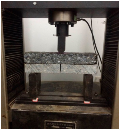 To accurately evaluate the crack resistance of HVASAL and RASAL, and investigate the propagation mechanism of the three types of crack, three-point bending failure tests and three-point bending fatigue performance tests were designed. Three-point bending failure tests were conducted to obtain the needed parameters for the three-point bending fatigue tests. Because of the thinness of the structure layer and the stress-absorption layer studied, the force control mode is closer to the actual stress state of the asphalt mixture in the pavement, so it can better explain the fatigue characteristics of the high viscosity asphalt [11]. Hence, the force-controlled loading mode was adopted for the three-point bending fatigue tests. For both the failure and the fatigue tests, the test temperature was set at 15 °C, the loading mode was the intermediate loading, the distance between the two ends was 250 mm, and the pressure head rate of the test machine was 2 mm/min, as shown in Figure 4. The ultimate load of the specimen was obtained by the three-point bending failure test. Forty percent of the ultimate load was used as the load for the three-point bending fatigue test.