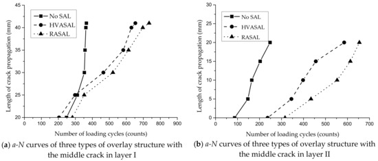 Two types of crack in the overlay of the specimen with the stress-absorption layer, propagated upwards across layers I and II. The data of the a-N curves with the stress-absorption overlay was graphed per each layer (a is the scale value of cracks in the overlay, and N is the corresponding number of load cycles). The a-N test curves of layer I and layer II for the three types of overlay with the middle crack are shown in Figure 5.