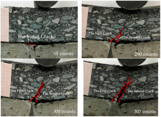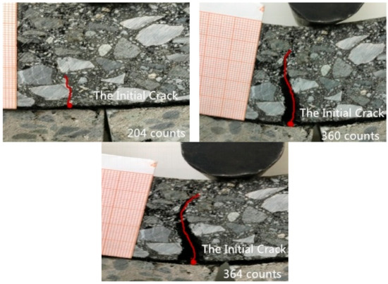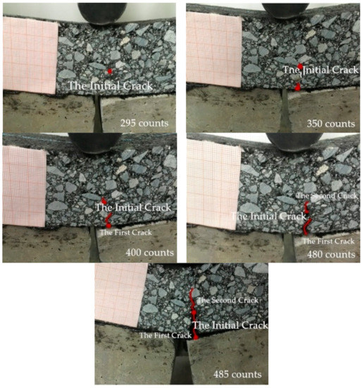 It was observed through the experiment that the initial cracking points for the middle cracks of the HVASAL and RASAL type structures were located at the interface between the stress-absorption layer and the surface layer. The cracks slowly propagated upwards, then some new cracks began to appear at the bottom of the stress-absorption layer, and the two cracks propagated upwards at the same time. The cracks in the two layers met as the length of crack in the stress-absorption layer reached 20 mm. It could be clearly observed that the cracks bypass the aggregate. As an example, the fatigue crack propagation process of the RASAL overlay structure is shown in Figure 6.