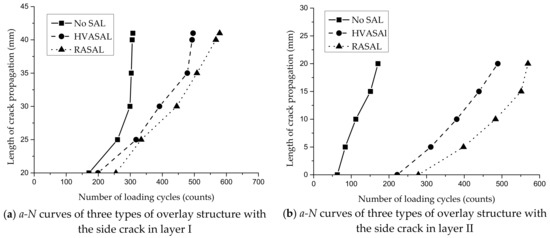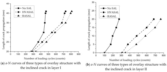 The a-N test curves of the three types of overlay structure with the inclined crack were compared with that of layers I and II, as shown in Figure 11.