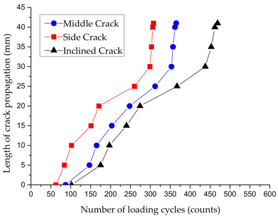 The test data was collected using a magnifying glass, the scale was marked across the overlay for easy observation, and the number of cycle loads corresponding to a crack propagation of 5 mm was used as the observation index [30]. The propagation of crack length corresponding to the load cycles was observed and recorded, as listed in Table 4.