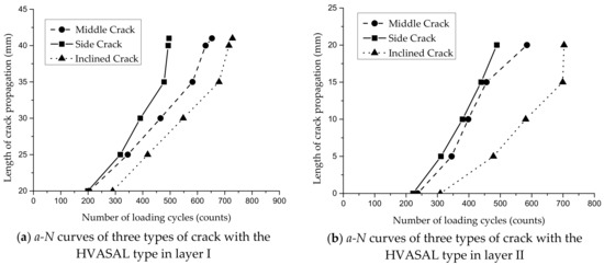 The a-N curves of the crack propagation of the HVASAL type with the three types of crack in layers I and II are shown in Figure 13.