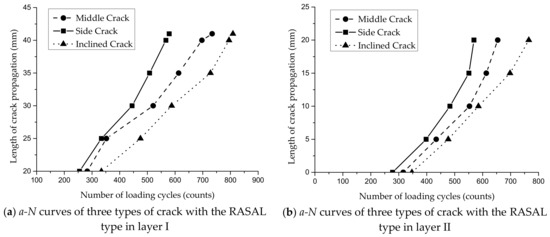 The a-N curves of the crack propagation of three types of crack in layers I and II of the RASAL type are shown in Figure 14.