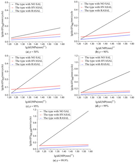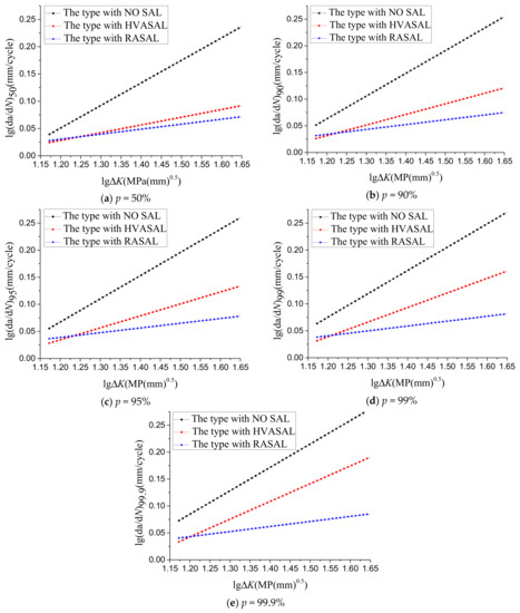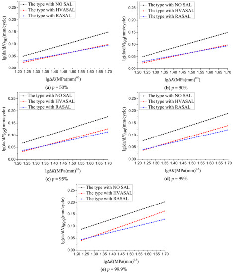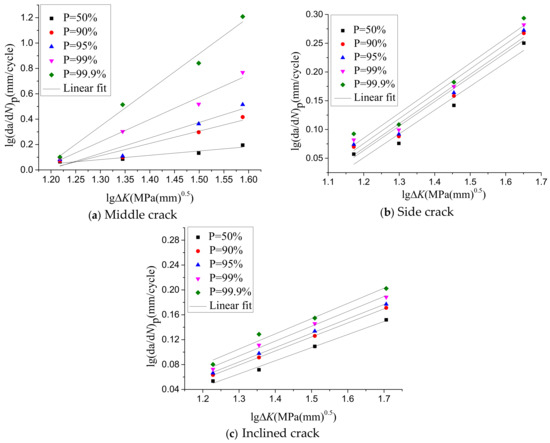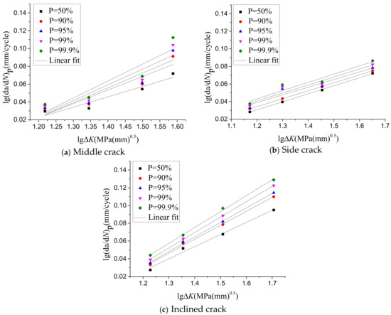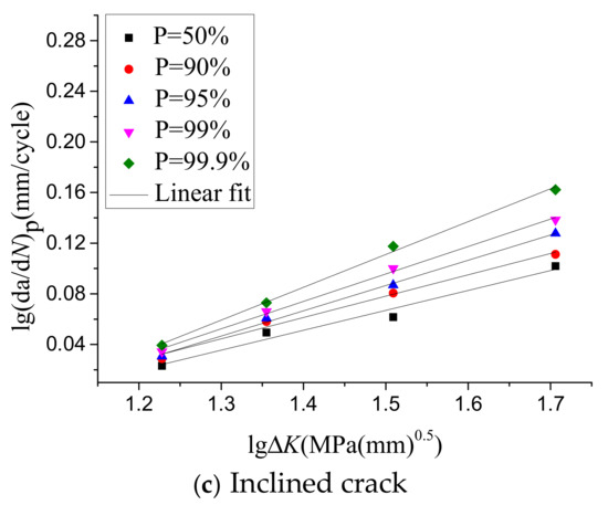 The relationships between lg ( d a d N ) and lg∆K for the three types of structures of different cracks on the basis of different reliability values were obtained by linear regressions using Origin software. The fitting results are shown in Figure 15, Figure 16 and Figure 17.
