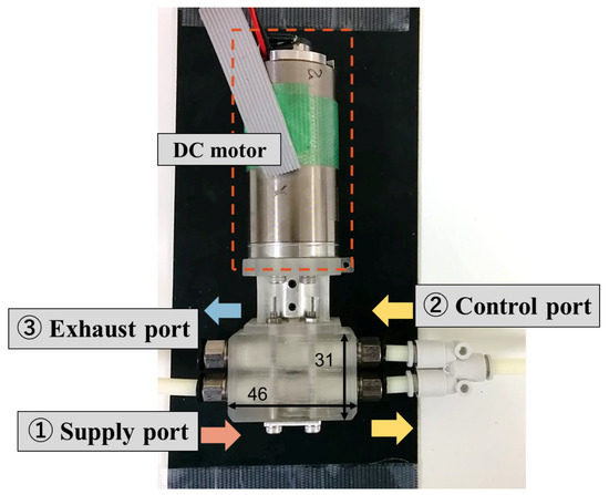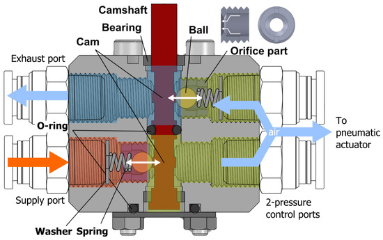 Figure 1 and Figure 2 respectively show the schematic and image of the developed valve. The valve mainly consists of a camshaft, two orifices, two metal balls, and a housing with two flow channels. The valve has four ports: a supply port, an exhaust port, and two control ports. Two control ports connect to one flow path downstream of the housing. Thus, the proposed valve is functionally equivalent to general three-port valves, though it apparently has four ports. The two orifices are arranged in each flow channel. The balls are placed upstream of the orifices. When the input voltage to the motor to rotate the camshaft is zero, air flow is obstructed as the two balls are pushed into the orifices by upstream pressure and spring force. A spring with a spring constant of 0.02 N/mm was used. Two springs are placed between the ball and the washer as shown in Figure 1. The port is opened when the camshaft is rotated, and the cam at the downstream side of the orifice pushes the ball. The cost of the camshaft is about US$650, owing to the complex shape. The costs of two orifices are about US$300. The body of the valve is printed by a 3D printer. Other elements are relatively inexpensive. The cost of creating the valve prototype is about US$950. However, when the valve is mass-produced, its cost may decrease by half.