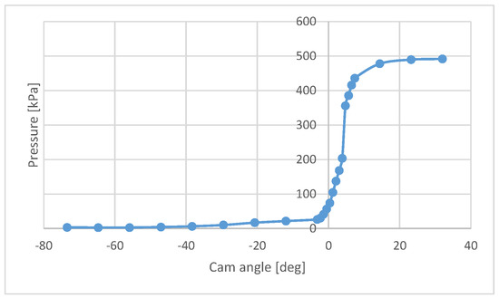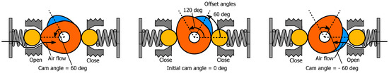 Figure 5 shows the designed cam shape. The left figure shows the cross-section of the cam, and the right figure shows the relation between the radius and angle of the cam. The difference between the maximum and minimum radii was set to 0.25 mm, as per the design described in Section 2.2. The cam was designed to linearly push the ball, as shown in the right figure of Figure 5. The controllable range of the cam was deg, as the cam was placed on the camshaft at an offset angle of 30 deg from the vertical axis, as shown in the middle figure of Figure 6, in order to prevent overlapping.