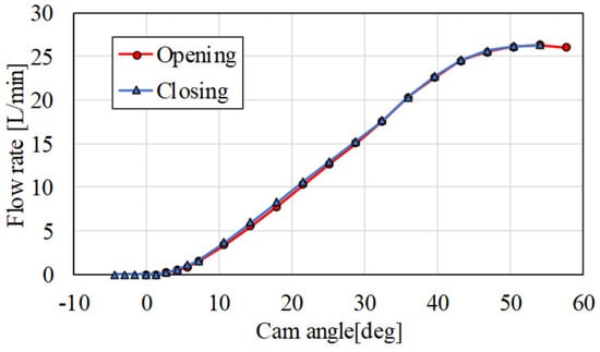 The experimental results are shown in Figure 7. The hysteresis of the flow rate to the cam angle was small. Flow rate changed linearly with respect to the cam angle. The maximum flow rate was 27 L/min, which was almost the same as the designed value. We confirmed that the value could achieve an almost zero-lap condition. Air leakage was 0.1 L/min or less, and the ratio of air leakage to the maximum flow rate was 0.37%. These values were fairly low compared to those of a spool-type servo valve (FESTO MPYE-5-M5-010-B), which exhibited air leakage of 1.9 L/min and a ratio of approximately 3.5%.