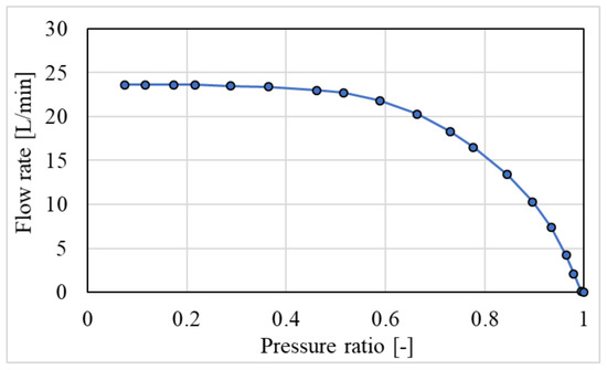 Then, we measured the flow characteristics of the valve using the experimental setup in accordance with the procedure recommended by ISO 6358. An experimental result with a cam angle of 40 deg is shown in Figure 8. As shown in the figure, the critical pressure ratio was 0.44 at a supply pressure of 500 kPa. The critical pressure ratios of commercially available valves are approximately 0.3 to 0.45 [17,19]. The path is geometrically symmetrical because the flow path is between the orifice and the ball. Therefore, the developed valve has a wide choke range compared with conventional valves.
