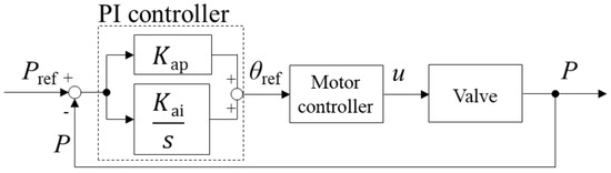 A PI feedback controller was used for pressure control. A PC was used as the controller; the measured pressure was entered into the PC by an AD converter. The control signal was provided to the DC motor through a DA converter. A block diagram of the pressure control is shown in Figure 10. The control parameters were determined by trial and error, and are listed in Table 3. The parameters were determined to be as large as possible to minimize offset during stable conditions. In this experiment, sinusoidal reference pressures with an amplitude of 20 kPa and an offset of 200 kPa were entered into the controller. The frequency of the reference input ranged between 0.1 and 30 Hz.
