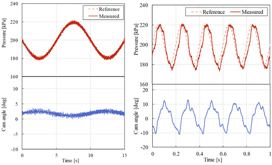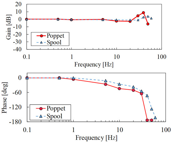 The experimental results at frequencies of 0.1 and 5.0 are shown in Figure 11. The upper figures show the pressure, and the lower figures show the cam angle. It is clear that the valve can control the pressure at a frequency of 0.1 . A small phase delay is observed at a frequency of 5.0 . The results were summarized in a Bode diagram, as shown in Figure 12. We confirmed that bandwidth was higher than 30 Hz when using the proposed valve. The phase lag became −180 deg at 40 Hz. This is considered to be a result of the motor dynamics. To enable comparison, we performed the same experiments using a commercially available spool-type servo valve (FESTO MPYE-5-M5-010-B), in which the maximum flow rate is approximately the same as that of the developed valve. The results for the spool-type valve are plotted in Figure 12. Up to 30 Hz, it is clear that the developed valve demonstrated almost the same performance as the spool-type servo valve. The dynamic response could be improved by changing the DC motor to one having a higher response.