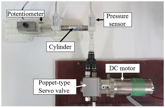 We executed a position-control experiment using a low-friction-type pneumatic cylinder. The experimental setup is shown in Figure 13. The DC motor was used to control the cam. The pneumatic cylinder used in the experiment had an inner diameter of 10 mm and stroke of 30 mm (SMC CJ2XB10-30Z). A load of 69.5 g was mounted on the rod tip of the cylinder. Supply pressure was set to 500 kPa. One chamber of the cylinder was kept at a constant pressure of 200 kPa, while the other chamber was controlled by the servo valve.