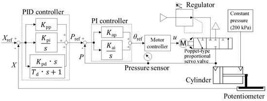 A block diagram of the position control is shown in Figure 14. A cascade control was designed. The main loop was a PID position control, and the minor loop was a PI pressure control. The control parameters listed in Table 4 were determined experimentally.